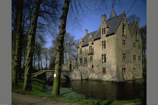 Kasteel Beauvoorde Ingeplant midden het dorp, ten N. van de kerk. Omwald kasteel in regionale Vlaamse-renaissancestijl midden op zijn beurt omwalde beboste tuin. Twee toegangshekken aan straatzijde. Gekasseide toegangsdreef. Ten Z.W., voormalige tuinierswoning (Wulveringemstraat, nr. 12) en koetsgebouw, uit XIX d. Jan de Valuwe, eerste gekende bezitter van de burcht (1408); verkreeg zijn leenheerrechten van Jan zonder Vrees. Volgende eigenaars resp. de Crucemeet, de Crane en Pieter van de Bampoele. L.g. was keurheer, schepen en landhouder van de stad en kasselrij Veurne. Zijn dochter Margareta van de Bampoele huwde in 1573 met Antoon de Briarde, heer van Beauvoorde te Watou cf. benaming van kasteel en van fusiegemeente van 1970 (Beauvoorde: Wulveringem-Vinkem). 1550- 1838: kasteel eigendom van de de Briardes. 1838-1875: drie verschillende eigenaars (landbouwers en brouwer). 1875-1908: eigendom van ridder Arthur Merghelynck (overleden in 1908). Vervolgens bij testament van l.g. geschonken aan het Rijk ten voordele van de Koninklijke Academie voor Taal en Letteren. Kasteel in regionale Vlaamse-renaissancestijl uit XVIIa; vlg. kroniekschrijver P. Heinderycx (1633- 1683), wederopbouw van het kasteel ca. 1616 behalve enkele oude muurgedeelten, door Jacob de Briarde, hoogbaljuw van VeurneAmbacht van 1623 tot 1643. Eind XIX, grondige herstellingswerken door A. Merghelynck waarbij ook verdwenen gedeelten imitatief wederopgebouwd werden, namelijk O.gedeelte van N.vleugel, O.zijtrapgevel van Z.vleugel en gedeeltelijke reconstructie van kruiskozijnen; voorts, neogotische kapel n.o.v. architect J. Vinck (Veurne). Bakstenen toegangsbrug uitlopend op kleine, gekasseide en ommuurde koer in oksel van N.- met Z.vleugel; korfboogdeur, schietgaten en kantelen (XIXd) Kasteelplattegrond. Tweedelige Z.vleugel (1, 2); W.gedeelte (1) van 1591 en vermoedelijk gelijktijdig O.gedeelte (2) echter met wederopgebouwde bovenverd. uit XIXd. Centrale gang (3) naar vierzijdige traptoren (4) op dakhoogte overgaand in acht. Licht achteruitspringende tweedelige N.vleugel (5, 6); W.gedeelte (5) van 1717 en deels op oude funderingen wederopgebouwd O.gedeelte (6) uit XIXd. Aanleunende kapel (7) uit XIXd, ten N. Verankerde baksteenbouw met gebruik van natuursteen voor kruis- en bolkozijnen. Licht gebogen en kort overstekende zadeldaken (leien) gedomineerd door huistoren. Geprofileerde schoorstenen o.m. met pilastertjes. Z.vleugel (1, 2) van drie bouwl. Twee Z.trapgevels naar de straat gericht; oudere W.trapgevel (één trav.) met muurankers 1591 (?) cf. jaartal 1591 op XIXd-balkslof binnenin, en twee lage steunberen. Bouwnaad tussen de twee trapgevels verwijzend naar de XIX dwederopbouw van bovenverd. en Z.trapgeveltop van het O.gedeelte van de Z.vleugel. Kruiskozijnen met ontlastingsboogjes; twee bolkozijnen beneden. Geveltoppen verfraaid met aedicula-kruisvenster voorzien van schelpvulling; typisch vensterschema uit XVI d-XVII a voor de Westhoek cf. o.m. Veurne. W.gevel van één trav. verhoogd met getrapt dakvenster; sporen van wijzigingen r. N.zijpuntgevel met aandak en muurvlechtingen; rondboogvenster met sluitsteen en imposten op de bovenverd. Ten N. van Z.vleugel, één trav. brede gang (3) deels onder laag aanleunend W.lessenaarsdak. Toegangsdeur aan koerzijde. N.aandak met top- en schouderstuk; muurvlechtingen. Achtzijdige O.huistoren (4) op vierzijdige onderbouw tussen Z.- en N.vleugel. Uitkijk gemarkeerd door rondboogvensters met imposten, sluitsteen en doorlopende lekdrempel. Geprofileerde bakstenen kroonlijst. Ingesnoerde spits (leien). N.vleugel (5, 6) van twee bouwl. W. gedeelte (5) van 1617 vlg. cartouche in W.gevel van drie trav. Kruiskozijnen, uitgezonderd rondboogvenster met imposten en sluitsteen r. op de bovenverd. Twee getrapte dakvensters . N.zijtrapgevel met kruiskozijnen. Haaks O.gedeelte (6) als imitatief aanhangsel uit XIXb; oude funderingen uitgezonderd O.trapgevel (twee trav.) met nieuwe muurankers 1607, en middenmuur binnenin. O.geveltop: kruiskozijn verdiept in rondboogomlijsting met schelpvulling. Ten N. van N.vleuel. aanleunende neogotische kapel (7) n.o.v. architect J. Vinck (Veurne), uit XIX d. Een beuk van twee trav. met driezijdige koorsluiting. Getoogde deur (O.) verdiept in spitsboogomlijsting met rondboognisje in het boogveld en druiplijst. Spitsboogvensters. Kleine rechth. W.sacristie onder aanleunend lessenaarsdak (leien); W.aandak met top- en schouderstuk; muurvlechtingen. Interieur. Ingang: houten reliëf met jaartal 1618, ingewerkt in nieuw plafond. Begin van de gang: stenen trap met twee paarsgewijze geplaatste zuilen van hardsteen ter ondersteuning van het trapgewelf, van ca. 1590. W.gedeelte van N.vleugel: monumentale schouw in de z.g. .Ridderzaal" en in de z.g. .Bourgondische zaal", resp. 1617 en 1618 gedateerd; schouw van 1617 met wapen van de Briarde op deksteen. Overig mobilair aangekocht door A. Merghelynck en getuigend van zijn verzamelwoede o.m. barokke lambrizering in de z.g. .Ridderzaal" afkomstig uit de kerk van de St.-Pietersabdij te Oudenburg. Ten Z.W., laag koetshuis onder zadeldak (Vlaamse pannen) met overstekende dakrand op houten modillons, uit XIXd. Sluit aan bij de traditionele baksteenarchitectuur van de streek uit XVII-XVIII, uitgezonderd de eerder zeldzaam voorkomende kruiskozijnen van natuursteen voor dit type van gebouw. Drie centrale korfboogpoorten met neuten en imposten. Drie dakvensters met inzwenkende belijning, top- en schouderstukken. Zijtuitgevels met aandak en muurvlechtingen. Artikel L. DEVLIEGHER in Burchten en hoevekastelen o.l.v. L.F. GENICOT (Het groot kastelenboek van België, I), Brussel, 1976, p. 49-51). DEVLIEGHER L., Beeld van het kunstbezit (Kunstpatrimonium van West-Vlaanderen, 1), Tielt-Den Haag, 1965, p. 108. MERGHELYNCK A., Le fief-manoir dit .le château de Beauvoorde" à Wulveringhem (1508-1900), 2 dln., Brugge, (1900-1901). MULS J., Jhr. A. Merghelynck en het kasteel Beauvoorde te Wulveringem, Brussel, (1953).