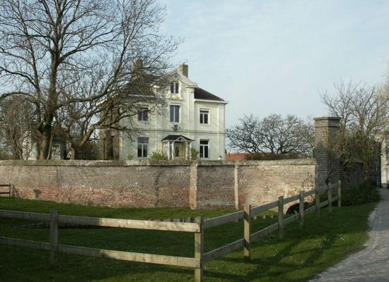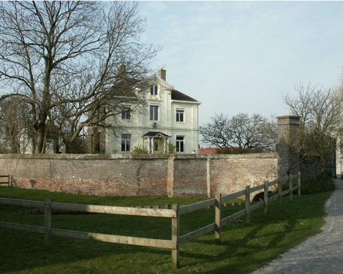 Zogenaamd "Kasteel van Uitkerke". Het kasteel van Uitkerke met het bijhorende neerhof wordt circa 1070 gebouwd op een terp, omgeven door een walgracht. De terp is opgeworpen na de zogenaamd Duinkerke III-transgressies (10de-12de eeuw). Het kasteel is gelegen ten noordoosten van de dorpskom, net onder de Evendijk. De ligging op een verhevenheid is afleesbaar op het verstedelijkte terrein, doch blijkt nog duidelijker uit een oude prentbriefkaart die ons een blik gunt op het kasteel vanuit de omgevende landerijen. De eerste vermelding van de Heren van Uitkerke dateert van 1270; dan is de Heerlijkheid in handen van Jan van Uitkerke. In 1488-1491 verwoesten de Bruggelingen het kasteel op dat moment in handen van Karel van Halewijn, waarna de stad Brugge wordt verplicht de schade te vergoeden. In de 16de eeuw (1557) komt de Heerlijkheid in handen van de familie van Claerhout, in 1636 gaat het over naar Isabella de Zuniga Y Fonseca, die ook de Heerlijkheden van Maldegem, Pittem, Koolskamp, Assebroek en Meetkerke bezit. In 1710 wordt Filip, prins van Croy, als erfgenaam van de heerlijkheid erkend. Emmanuel Francis van Croy is de laatste heer van Uitkerke in de periode 1770-1794. Hij bouwt in 1763 het kasteel, dat tweemaal werd geruïneerd, opnieuw op in rococostijl. Hij stelt hiervoor architect Berger aan die ook werkt voor de prinsen de Ligne te Beloeil. Als uitgangspunt zou hiervoor het Hermitagekasteel te Condé-sur-Escaut genomen zijn, tevens eigendom van de familie van Croy. Het wordt een "plaisant château utile et intéressant par sa position" (citaat uit 'Mémoires de ma vie' van maarschalk van Croy). In 1794 wordt de heerlijkheid van Uitkerke afgeschaft; het kasteel blijft bestaan en blijft tot midden de 19de eeuw eigendom van de familie van Croy. Op de Vander Maelenkaart (1842) wordt het goed dan ook nog aangeduid als het "Kasteel Le Croy". In 1846 wordt het kasteel eigendom van de bankier Felix Sabot Dujardin. In 1880 verbouwt eigenaar Joannes Delcijn, een Brugse landmeter, het huis waarbij enkel het voorste gedeelte van het volume wordt behouden (dit volume is nog herkenbaar). Aan de achterzijde wordt haaks op het voorste volume een nieuwe vleugel gebouwd. In 1929 wordt deze achterbouw nog eens uitgebreid door eigenaar Cornelis Vogels. In 1933 bouwt Vogels nog een laag (keuken)volume aan de oostzijde aan. Oorspronkelijk zag de constellatie van de bebouwing er als volgt uit (alleszins nog behouden eerste helft 19de eeuw cf. primitief kadasterplan circa 1835 en de Atlas der Buurtwegen (circa 1843): "Het Opperhof was gevestigd op een mote en omgeven door een cirkelvormige walgracht met een doorsnede van circa 50 m. Op de verhevenheid staat thans een achttiende-eeuws kasteeltje in rokokostijl. Een deel van de walgracht is bewaard gebleven. De dreef van het kasteel mondde oorspronkelijk op de Oude Steenweg uit (.) Even ten westen van het kasteel stond het Nederhof binnen het terrein, dat door een tweede cirkelvormige walgracht omgeven was" (M. Coornaert). Van de hoeve zijn nog de witgeschilderde volumes van het boerenhuis en een nutsgebouw (zomerkeuken ?) met 18de-eeuwse kern bewaard, doch in een erg verbouwde staat. De kleine omwalling bleef gedeeltelijk bewaard, de omwalling van opperhof en neerhof is volledig gedempt. Het huidige kasteel gaat terug op 1763 en is gelegen op een nog deels omwalde terp. De terp zelf is met een bakstenen muur (vermoedelijk 19de-eeuws) omringd, waarop ten zuiden een boogbrug met smeedijzeren hekken tussen poortpilasters aansluit. Het oostelijk gedeelte van de omwalling is gedempt bij de aanleg van de spoorweg Brugge-Blankenberge in 1863-1868 (het oostelijk deel van het perceel waarop het kasteel staat wordt hierbij recht afgesneden). Aan de noordzijde is de terp afgegraven, vanaf de achterbouw van het huis komt men via een trap in een diepere fruit- en moestuin; ook hier is de omwalling gedempt. Rond de terp is een tuin aangelegd met fruitbomen en struiken. Ten gevolge van de opeenvolgende verbouwingen evolueerde de plattegrond van quasi-rechthoekig tot T-vormig met een lage aanbouw in de oksel van het hoofdvolume en de achterbouw. Bepleisterd bakstenen gebouw van twee bouwlagen, hoofdvolume onder pannen schilddak (Vlaamse pannen), achterbouw onder haaks schilddak en plat dak. Oostaanbouw als keuken onder plat dak. De voorgevel (zuidgevel) van drie traveeën is een witgeschilderde lijstgevel met klassieke opbouw: pilastergevel met hoger uitgewerkte centrale deurtravee oplopend in fronton met mooi afgewerkte houten kroonlijst, waarin bovenvenster in geelbeschilderde rococo-omlijsting. Beglaasde vleugeldeur met hekwerk voorafgegaan door houten deels beglaasde portiek (toevoeging, nog niet op oude prentbriefkaart, cementtegelen vloer met geometrisch motief); waarboven gepolychromeerd wapenschild met bekroning. Horizontale geleding door kordon en imitatievoegen. De overige zijden van het huis zijn eenvoudig gecementeerd, wel lopen de kordonlijsten van de voorgevel door. Bij de haakse achteruitbouw herhaling van de afwerking van het fronton van de voorgevel inclusief de vorm van het venster doch in een eenvoudige omlijsting. Rechthoekige muuropeningen in geriemde omlijsting; eenvoudige T-vensters, op de bovenverdieping deels met rolluikkasten. Interieur. Via de vleugeldeur komt men in een kleine inkompartij met cementtegelen vloer. Rechts is de oorspronkelijke eikenhouten trap (jaren 1760) bewaard, uitgewerkt met een dubbelkwart waar de trap de muren volgt. Erg mooie trapklauw als aanzet van het uitgewerkte traphek met Lodewijk XV-versiering. Eternieten wandlambrisering vermoedelijk uit eind de jaren 1920-begin 1930 (cf. laatste verbouwing). Op de bovenverdieping van het oorspronkelijk volume nog enkele bewaarde Lodewijk XV-elementen zoals de wandlambrisering met schouderboogvormige panelen met rocailles en plantmotieven en schouwboezem met Lodewijk XV-decoratie in stucwerk (doch eenvoudige marmeren schouw uit de eerste helft van de twintigste eeuw). De aankledi
