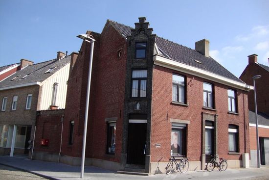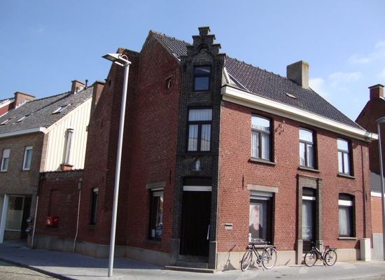Hoekpand uit het vierde kwart van de 19de eeuw, mogelijk voormalig café. Dubbelhuis van drie traveeën + afgeschuinde linker hoektravee en twee bouwlagen onder pannen zadeldak (nok parallel aan de straat). Verankerde donkere baksteenbouw boven arduinen plint. Getoogde en rechthoekige muuropeningen. Huisdeur tussen pilasters en druiplijst van gesinterde baksteen; dito hoektravee met café(?)deur opgenomen in een Brugse travee uitlopend in een trapgeveltje; heiligennisje boven de deur. Linker zijgeveltop afgewerkt met oculi en vlechtingen. Vernieuwd houtwerk.