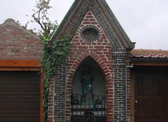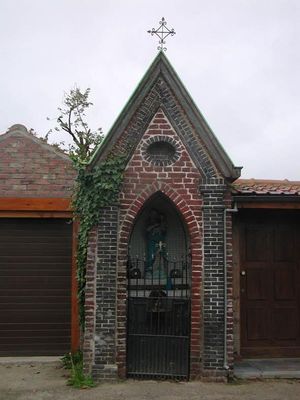 Wegkapel van 1873 toegewijd aan Onze-Lieve-Vrouw troosteres der bedrukten. Bedehuis op rechthoekige plattegrond; halfronde apsis. Baksteenbouw onder zinken zadeldak. Fraai uitgewerkte puntgevel bekroond door ijzeren kruis. Spitsbogige deuropening geflankeerd door twee pilasters van zwarte baksteen. Top met blinde oculus, eveneens van zwarte baksteen. Met schijnvoegen bepleisterd en beschilderd interieur. Plaasteren beeld O.-L.-Vrouw met kind vertrapt slang. Historische studie Kapellen Sint-Denijs, Zwevegem, s.d., p. 39.