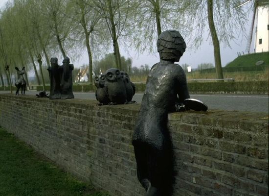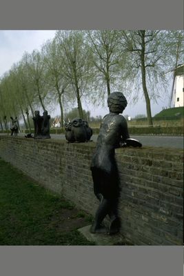 * Damse Vaart-Zuid z.nr. Uilenspiegelmonument gerealiseerd door de beeldhouwer Jef Claerhout (°Tielt, 1937) en geschonken door VTB-VAB in 1979 ter herdenking van het overlijden van Charles de Coster (München, 1827-Brussel, 1879), auteur van het Uilenspiegel-epos. Opgenomen in het stadsgezicht, beschermd bij M.B. van 13/10/1986, gewijzigd bij M.B. van 30/03/1987. Het verhaal van de legendarische figuur van Tijl Uilenspiegel wordt wellicht ca. 1500 voor het eerst door Hermann Bote uit Braunschweig (Duitsland) opgetekend. Volgens de legende wordt hij geboren in het Saksische Kneitlingen en sterft hij in Mölln. Dankzij de opkomst van de boekdrukkunst krijgen de oorspronkelijk Duitse volksboekjes een snelle verspreiding in heel Europa. In de 17de eeuw laten bepaalde volksboeken Uilenspiegel in Damme begraven worden, dit door een verkeerde interpretatie van een voorstelling op de zerk van het graf van Jacob van Maerlant (cf. Kerkstraat, kerkhof aan de O.-L.-Vrouwekerk). Sindsdien kent Damme een sterke Uilenspiegeltraditie. De bekendste uitgave is die van Charles De Coster (1827-1879) die als eerste Uilenspiegel ook laat geboren worden in Damme, dit ten tijde van de Spaanse overheersing en de godsdienstoorlogen. Hij verwerkt dit tot het epos "La légende d'Ulenspiegel" (1867) ook gekend als "La Légende et les Aventures héroïques, joyeuses et glorieuses d'Ulenspiegel et de Lamme Goedzak au Pays de Flanders et ailleurs" (1869). Bronzen beeldengroep aan bakstenen muur geplaatst op het plantsoen van het smalle pleintje tussen de Damse Vaart-Zuid en de Speystraat, die ten zuidoosten erbij aansluit. Het kunstwerk stelt Tijl Uilenspiegel voor die een spiegel voorhoudt aan dieren die een deel van de maatschappij symboliseren, hierbij verwijzend naar een passage waar Uilenspiegel dit doet op de markt te Damme. De uilen staan voor de geleerden, de maraboes voor de geestelijken, de ezel met de bel voor de politici en de kikkers tenslotte voor het gewone (kwakende) volk. Opschrift in bronzen plaat "VTB-VAB/ UIT BEWONDERING VOOR/ TIJL UILENSPIEGEL EN DAMME/ MEI 1979". DE LAENDER G., Uilenspiegellegende-wandeling, Damme, 1999.HEYNEMAN D.; HEYNEMAN L., Ontdek Damme. Praktische gids, Damme, 1977, p. 46-47.