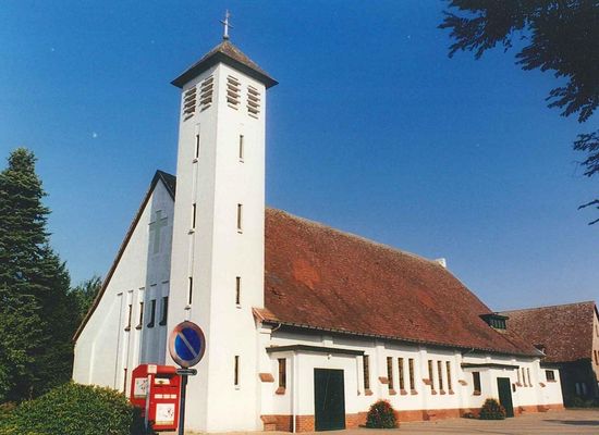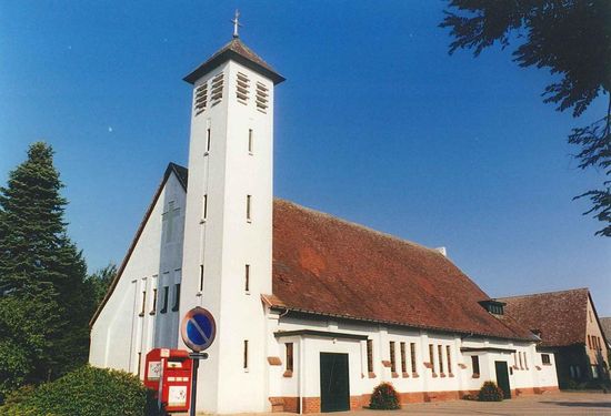 Pal aan de straat gelegen zuid-noordgeoriënteerd bedehuis van grotendeels witbeschilderde baksteen, deels met houten kroonlijsten, gebouwd naar ontwerp van architect F. Theuwissen (Lommel) in 1954-55. Volgens V. Leysen (2001) zou de toren later zijn aangebouwd. Grosso modo aansluitend bij de "gestileerde" kerkenbouw van toen, confer parochiekerk Onze-Lieve-Vrouw van Lourdes aan de Slinkerstraat.