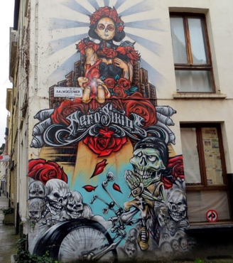 Rond het straatnaambordje is een werk van Rise One (alias voor Yves Tordoir) van de Aerosol Kids geschilderd. Intussen noemen ze zich de Aerosol Kings en vormen de grootste graffiti crew van Antwerpen. Het werk is geïnspireerd op Dia de Muertos. Dat is de dag waarop ze in Latijns Amerika hun doden herdenken. De vrouw op het kunstwerk heeft een kloppend hart vast