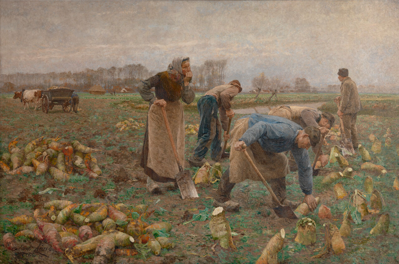 Emile Claus schilderde “De bietenoogst” hier op dit veld, dicht bij zijn huis en atelier, de door hemzelf zo gedoopte “Villa Zonneschijn” in Astene bij de Leie. Het is een monumentaal doek, een bijna levensecht “tranche de vie" van 3,30 meter hoog en 4,80 meter breed. Claus werkte vermoedelijk in de najaarsmaanden van 1888 en 1889 aan het doek, tijdens de volle bietenoogst. De schilder stelde het enorme canvas, hangend aan een staketsel integraal op in de open lucht van het bietenveld. Claus liet vaak figuranten uit Astene poseren. Adèle Rogghe en Henri Van Laere waren buren en figureren in “De bietenoogst” op de voorgrond. “Elk schilderij van Claus heeft eene geschiedenis, is eene geschiedenis”, zo vatte schrijver Karel van de Woestijne het oeuvre van de kunstenaar samen. Zijn werk werd gesmaakt en gekocht door de burgerij die kunst op een zondagmiddag ging bewonderen. Ze stond in twijfelachtige bewondering voor dit soort visualisering van het landleven, voor de lichamen die roken naar zweet en zich bogen over de zware grond. Emile Claus is “De bietenoogst” heel genegen gebleven. Het werk kreeg van de schilder zelfs een koosnaam. Hij noemde het “zijn betteraven” en het zou heel zijn leven in zijn atelier blijven hangen. Jaren na zijn dood, in 1942 schonk zijn weduwe het doek definitief aan het Museum van Deinze en de Leiestreek.