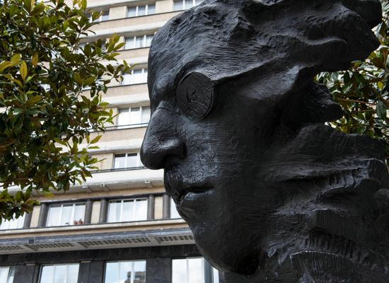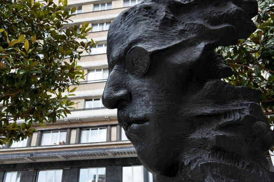 Het monument op dit driehoekig pleintje verbeeldt de grote Portugese dichter Fernando Pessoa (1888-1935). Hij schreef niet alleen onder zijn eigen naam, maar ook onder heteroniemen: in naam van denkbeeldige dichters en filosofen. Een standbeeld van Pessoa in Brussel? In de jaren 1950 vestigde zich in deze buurt een belangrijke gemeenschap van Portugese arbeiders, die hier in de industrie kwamen werken om de armoede in hun land te ontvluchten. In de zijstraten rond het plein vind je nog heel wat Portugese cafés en restaurants en ook een bakker. Omdat het Flageyplein dicht bij de Europese wijk ligt, kregen die Portugese arbeiders het gezelschap van hoger opgeleide landgenoten en van andere Europeanen. Ook de Fransen zijn hier bijvoorbeeld zeer goed vertegenwoordigd.
