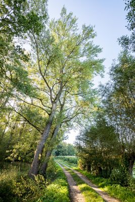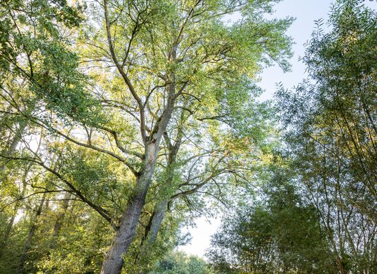 Je staat hier voor een verzameling van Europese en Amerikaanse zwarte populieren. Alle bomen in het begin van de aanplanting zijn Amerikaanse zwarte populieren. De Europese tegenhangers kan je van hier niet zien, maar de twee exemplaren op de foto zijn wel degelijk Europese zwarte populieren.