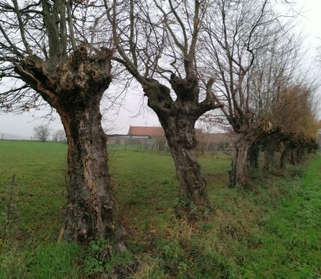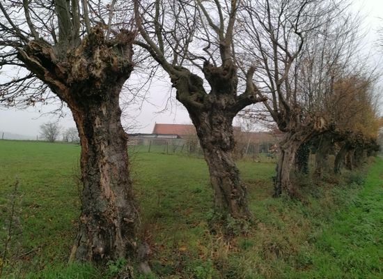 Knoestige knotbomenrij langs de eeuwenoude weg tussen Halle en Nijvel.