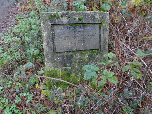Gedenksteen met opschrift: "HIER VIEL EL-CID MET EEN GROOT RUITER". Onderaan de steen staat de afbeelding van een paardenhoofd. Googlen levert het volgende op: in 1986 viel een Lommelse bioscoop-eigenaar in beschonken toestand van zijn paard. Het paard heette El-Cid en was op slag dood maar de ruiter overleefde de val. De steen zou een macaber grapje zijn van zijn rijke vrienden. Info komt uit de serie "Merlijn over de grens" van omroep Brabant die het weer van de Bergeijkse heemkunde-vereniging heeft.