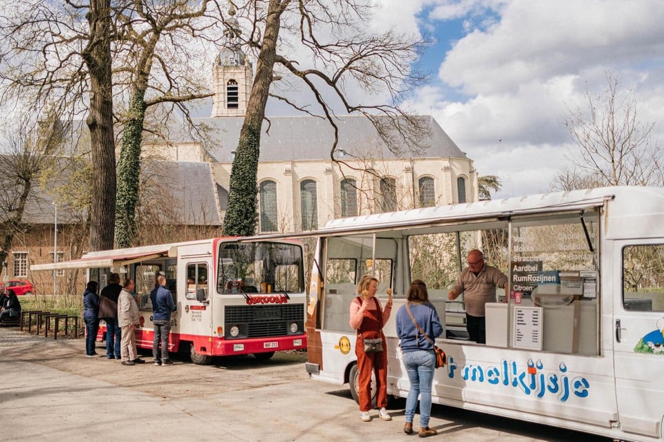 Wandelaars, fietsers, buurtbewoners, toeristen, in de dreef over de abdijpoort is het een vrolijke processie van mensen die een ijsje komen kopen aan een van de ijskarretjes. “Als kind kwamen wij hier geregeld een crèmeke lekken. De ijskarretjes staan bekend om hun grote bollen”, knipoogt Jochen.