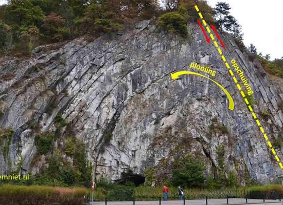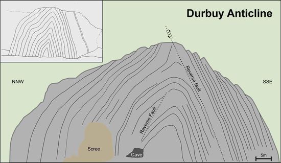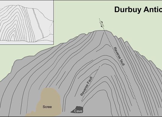 De grote rotswand vlak naast het stadscentrum van Durbuy is de Anticlinaal van Durbuy, al wordt de rotswand ook wel Anticline, Roche d’Omalius of Roche de Falize genoemd. De rotswand, bestaande uit kalksteen, is 37 meter hoog en de gesteentelagen zijn hier goed in te zien. Die gesteentelagen zijn geplooid in een antlicine, vandaar de naam. Dit is een plooiing naar boven van de aardlagen en dat betekent dus dat de oudste lagen in het midden zitten. Hierdoor heeft de rotswand de vorm van een omgekeerde U. De rotswand is zo goed te zien door de erosie die de Ourthe veroorzaakte. Die liep namelijk eerst nog voor een deel voor de rotswand en heeft zo een groot deel van de heuvel weggesleten. Naar schatting zouden de gesteenten zo’n 375 miljoen jaar oud zijn.