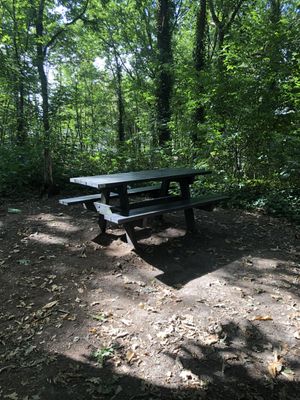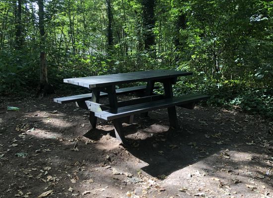 Net voorbij wandelknooppunt 33 naar 34 is deze picknickbank te vinden in het bos.