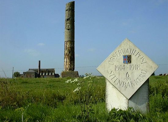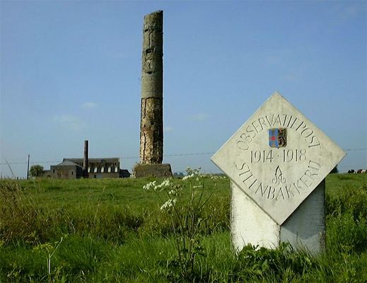 Observatieposten 1914-1918 Langsheen de frontlijn worden al vlug kerktorens, molens en andere gebouwen, die een uitzicht bieden op de omgeving opgeëist en gebruikt als observatiepost. Over deze observatieposten wordt er echter weinig verteld in de oorlogsliteratuur. Ze zijn slechts door een klein aantal soldaten bemand, die een beurtrol van drie man per dag hadden. De waarnemers moeten het mondingsvuur van de vijandelijke kanonnen observeren en de gegevens doorseinen aan de eigen artillerie om een tegenaanval in te zetten. Tijdens de beschietingen wordt door hen de richting van het eigen artillerievuur bepaald. Op andere momenten volgt men vanop de observatiepost vijandelijke troepenbewegingen of het aanleggen van nieuwe versterkingen en loopgraven. De stations op de spoorlijn Nieuwpoort-Diksmuide liggen op de 1ste linie en komen voor deze taak uitstekend in aanmerking. Binnenin worden stevige, torenachtige constructies uit betonnen balken opgetrokken. Dikwijls wordt het gebouw stukgeschoten, maar de observatiepost blijft overeind. In Ramskapelle zijn bij het voormalige station nog de resten van een observatiepost overgebleven. In Ramskapelle gebruikt men schoorstenen van een groot steenbakkerijcomplex als ‘Observatiepost’ van waaruit men de hele omgeving in ogenschouw kan nemen. De gebouwen, waar manschappen ondergebracht zijn, worden herhaaldelijk onder vuur genomen. Zeker één van de ronde schoorstenen wordt als observatiepost gebruikt en is nu nog gedeeltelijk bewaard. De gele bakstenen binnenkant is vanaf de huidige bovenkant tot ongeveer in het midden ingekapseld in gewapend beton, waarvan het betonijzer op vele plaatsen uitsteekt. Via een smalle toegang vat men een klimpartij aan, door een nauwe trechter naar één van de betonnen platformen, voorzien van kijkgaten. Van hieruit heeft men een uitzonderlijk goed uitzicht op het kanaal Nieuwpoort-Veurne en het achterliggende gebied, het dorp Ramskapelle en de stad Nieuwpoort met haar sluizencomplex.