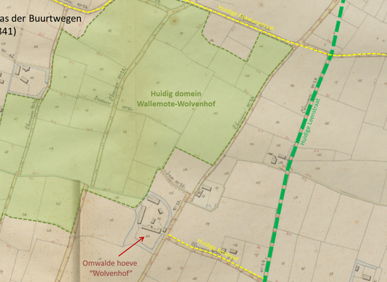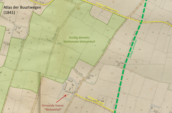 Deze hoeve "Wolvenhof" was oorspronkelijk een omwalde hoeve en bestond al midden 18e eeuw. De hoeve heeft zijn naam gegeven aan één van de twee kastelen in het nabij gelegen kasteelpark Wallemote-Wolvenhof. Waar de naam “Wolvenhof” precies vandaan komt, is niet duidelijk. Een hardnekkig verhaal over een wolf die z’n nest had gemaakt in de verlaten hoeve is wellicht een recent verzinsel. Lang geleden werden er wel schapen gehoed op en rond de hoeve. Werd er misschien ooit een schaap doodgebeten, en werd er toen een wolf als dader aangeduid? Of heeft de naam iets te maken met een familie Dewulf, die begin 20e eeuw vlak naast de hoeve woonde?