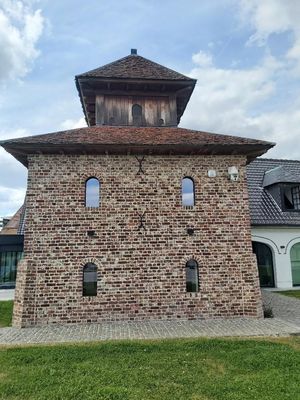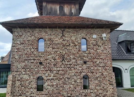 De duiventoren midden op het erf dateert wellicht uit de 19e eeuw, werd recent gerestaureerd en is momenteel in gebruik als bureauruimte. In de middeleeuwen was het houden van duiven een voorrecht van de adel en geestelijkheid. De jonge duiven werden gegeten, terwijl de rijke duivenmest werd gebruikt op het land. De duiven vonden hun voedsel op de omliggende akkers, wat schade toebracht aan de oogsten van de landbouwers. De Franse revolutie schafte veel privileges af, zodat ook particulieren voortaan duiven konden houden. Postduiven zijn dan weer een heel ander verhaal, want deze werden nog lang gebruikt voor militaire doeleinden. Dit is ook de reden waarom het houden van duiven tot op vandaag strak is geregeld door de overheid. De duiven die ooit in deze duiventoren huisden, waren wellicht vooral bedoeld voor duivenmest en liefhebberij.