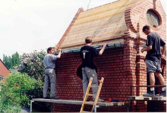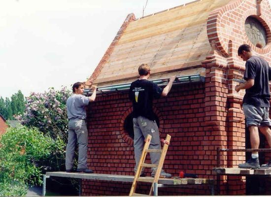 In het Ieperse dorp Elverdinge kwamen de leerlingen ter plaatse een nieuwe Lourdeskapel bouwen in de Sint-Livinusstraat. De kapel, in de volksmond Cats kapelle, werd in 2000 gesloten vanwege bouwvalligheid. Een jaar later had het VTI er een nieuwe kapel klaar. “De broer van mijn man maakte nieuwe brandglasramen, onder meer op basis van tekeningen uit het derde kleuter van de lokale basisschool”, zegt Christa Ryckeboer, overbuur van de kapel (geen familie van Chris, red.). “Ik open de kapel dagelijks, nadat ik de sleutel erfde van een andere buurvrouw, die overleed.” “Verschillende buurtbewoners helpen bij het onderhoud van de site: onkruid wieden, het gras maaien, de haag scheren...”, zegt Christa. “De kapel is tijdelijk weer gesloten omdat na al die jaren stenen zijn losgekomen. Dat vinden veel mensen jammer: ze komen er nog graag een kaarsje aansteken of even bezinnen. Het VTI heeft beloofd om herstellingswerken uit te voeren. Soms kom ik nog oud-leerlingen tegen die me aanspreken over de vroegere bouwwerken. Ze zijn nog altijd fier op ‘hun’ kapel.”