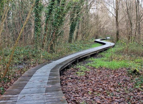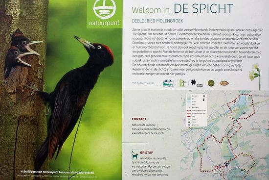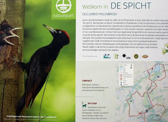 Dwars door het Molenbroek loopt dit kronkelig houten vlonderpad. Geen rechte, saaie weg, maar een bijna krullende wegel. Dit nat gebied maakt deel ui van het natuurgebied ‘De Spicht’ dat beheerd wordt door Natuurpunt Lubbeek. Het is gelegen aan de Molenbeek en is een bijzonder rijk reservaat, vooral omdat we hier de zeldzame combinatie hebben van een venig gebied dat onder invloed staat van kalkrijke bronnen. Oorspronkelijk waren grote delen van het gebied bedekt door populieren, bestemd voor de industrie. De gevolgen waren evenwel negatief voor de diversiteit van fauna en flora. Het was dus noodzakelijk om die bomen te hakken en terug te keren naar oorspronkelijk broekbos en naar soortenrijke hooi- en weilanden. En dat loont. Je vindt hier niet alleen een rijk leven, maar ook zeldzame soorten zoals het oranjetipje of de alpenwatersalamander