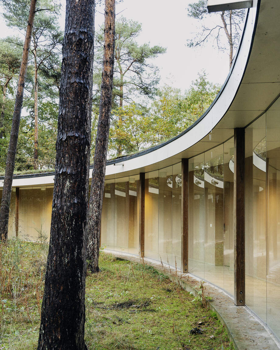 Vanuit Kasterlee hoef je daar niet ver voor te rijden. Na nauwelijks 5 minuten fietsen sta ik aan de rand van het grote bos van de Hoge Rielen. Op dit voormalige militaire domein staan een dertigtal identieke munitieloodsen die sinds 1977 gebruikt worden als groepsaccomodatie. Menig Vlaming kwam hier al op kamp of op bezinning. In 2004 maakten de Italiaanse architecten Secchi-Viganò een masterplan voor het hele gebied in samenwerking met de Vlaamse Bouwmeester (het domein is eigendom van de Vlaamse overheid). Dankzij die langetermijnvisie is er nu ook aandacht voor de historische, ecologische en educatieve waarde van het domein. En dat vertaalt zich ook in de architectuur. De afgelopen twee decennia werden, dankzij een reeks architectuurwedstrijden, een vijftiental loodsen succesvol gerestaureerd met respect voor het militaire verleden van de plek.