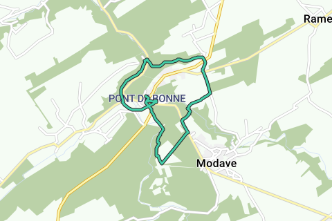 Deze wandeling vertrekt aan het "Syndicat d'initiative" in Pont de Bonne. Ze is ook afgebakend met een blauwe liggende rechthoek. De tocht leidt ons via het kasteel van Modave, een steengroeve naar Limet. Via een bospadje komen we op de Ravel, vanwaar we terug naar onze vertrekplaats wandelen.