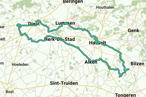 Hoeselt – Schalkhoven – Vliermaal – Wintershoven – Kortessem – Wimmertingen – Alken – Ter Koest – Stevoort – Herk De Stad – Donk – Halen – Loksbergen – Assent – (steenweg Diest-Leuven) – groen bordje 93 tot Scherpenheuvel Terugweg: Diest - Schaffen - Schans - Linkhout - Lummen - Stokrooi- Hasselt - Diepenbeek - Hoeselt