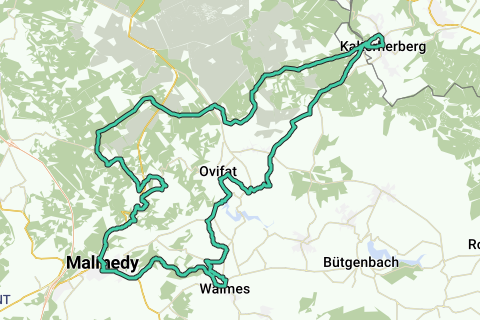 Daarna gaat het naar Küchelscheid waar we de Vennbahn, een mooi plaatsje om in een oude wagon te genieten van je picknick. Daarna rijden we even Duitsland binnen tot aan het gehuchtje Kalterherberg. Daarna keren we terug naar de Vennbah om de terugtocht aan te vatten. We rijden een heel stuk naast de railbikes die we op een bepaald moment ook zullen kruisen. Iets voorbij Bôsfagne verlaten we de Vennbahn om langs het stuwdam van Roberville verder te bollen. In Weismes gaan we terug de Vennbahn op. Doorheen een prachtig dal voert deze ons naar Malmedy. Op de marktplaats is het heerlijk toeven en ook toch een beetje op krachten komen gezien straks een helling van ongeveer 5 km wacht met een stijgingspercentage van max. 6%. Alvorens de laatste klim aan te vatten naar het "centrum" van Mont (de startplaats) kan ook nog de afslag genomen worden naar Xhoffraix met als ideale afsluiter het terras van Chez Remi. Van daar is de terugkeer naar Mont immers heel makkelijk en heeft dit geen vergelijk met wat er reeds geklommen werd.