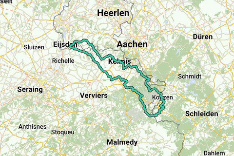 Teuven – Slenaken – Hoogcruts – Banholt – Mheer – Mesch - S.G.V. – S.M.V. – Veurs – Hagelstein – Merckhof – Henri-Chapelle – Welkenraedt – Rabotrath – Eupen – Kettenis – Unterstadt – Wesertalsperre – Ternell – Küchelscheid – Kalterherberg – Perlenbachsperre – Heidgen – Monschau – Menzerath – Imgenbroich – Hengstbrüchelen – Konzen – Entenpfulh – Konzener Venn – Mückenheide – Petergensfeld – Raeren – Berlotte – Eynatten – Astenet – Hergenrath – Kelmis – Moresnet – Blieberg – Hombourg – Remersdaal – Teuven