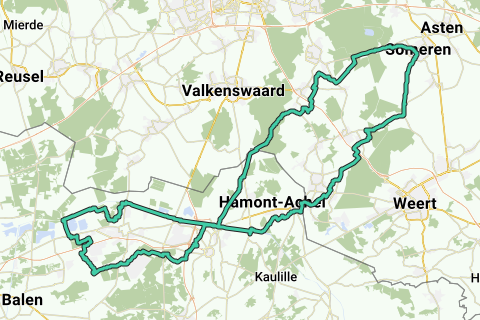 Vanuit Someren fiets je richting Sterksel (Vlaamse Weg) en via het buitengebied van Leende naar Leenderstrijp. Dan fiets je via een smal geasfalteerd fietspad door het Leenderbos, overgaand in breed geasfalteerd fietspad tot aan de Achelse Kluis. Via het fietspad over de oude trambaan fiets je richting Pelt, om vervolgens het jaagpad te volgen over de noordoever van Kanaal Bocholt-Herentals.