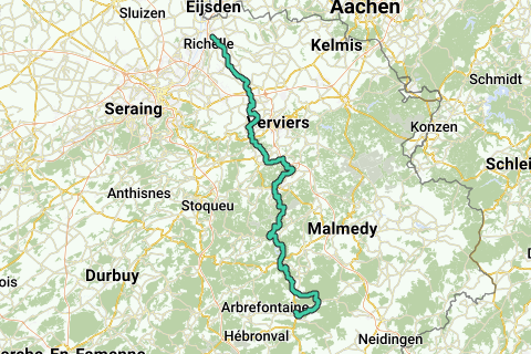 Vise, Spa, Stavelot, Vielsalm. Route is binnendoor, maar wel in de buurt van een snellere weg. Mocht je dus onderweg willen overschakelen, dan kan dat.
