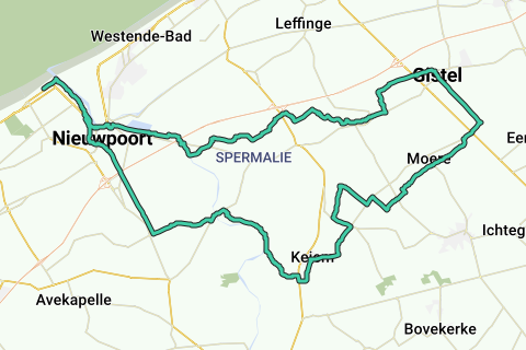 Van Zeedijk Nieuwpoort fietsen we via de promenade en het maritiem park richting Nieuwpoort stad. We volgen de IJzer tot Mannekensvere en daar langs kleine wegen door de polders richting Gistel. In Gistel volgen we een stukje van een oud treinspoor tot knooppunt 34. Hier vervolgen we onze weg terug via de polders richting Nieuwpoort terug naar het startpunt