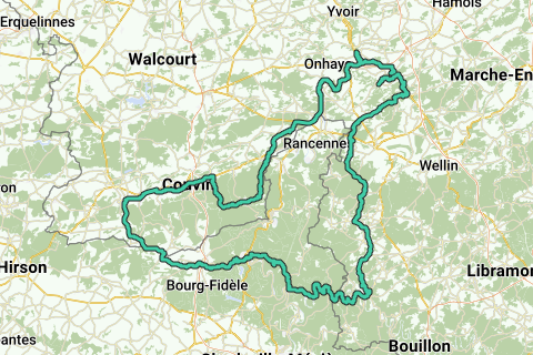 VIA CELLES EN HOUYET NAAR VRESSE SUR SEMOIS EVEN FRANKRIJK BINNEN TOT IN ROCROI OM VERVOLGENS TE STOPPEN IN CHIMAY EN DAN VIA COUVIN EN LE MESNIL RICHTIG MAAS TE RIJDEN TOT IN DINANT DAAR DE MAAS OVER STEKKEN OM VIA ANSEREMME TERUG IN CELLES GENDRON TE KOMEN