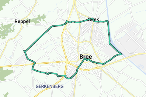 Vertrek in de Toekomststraat zandweg richting brug onder de Hamonterweg dan richting Beek Bocholterweg oversteken Graevenstraat Beek Centrum richting Bree nemen. Dan links in de Jef Vanhoofstraat richting kanaal. Langs het kanaal naar Kanaalkom in Bree, kanaalkaai. tijd voor een stop in het Tolhuys kanaalkaai 3 Bree. verder rechts de Brugstraat volgen tot in Bree centrum Opitterpoort, Opitterstraat, Vaesstraat aan Ijssalon de potter pauze mogelijk (de potter, historiek,De Croon enz.) mogelijkheid om het stadsmuseum te bezoeken open zondags van 14 tot 17 h of in de week na afspraak op 089848595 verder door de Kloosterstraat rechtdoor Kloosterpoort dan Gruitroderkiezel iets verder rechtsaf Boneputstraat volgen tot aan de meeuwerkiezel oversteek naar Bieskenstraat , Bleekstraat dan de Hansweg volgen tot aan camping Kempenheuvel Heuvelstraat oversteek peerderbaan naar de Nieshofstraat, Toekomststraat.