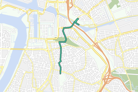 Steek het Koningin Astridplein over en steek opnieuw over naar de Van Schoonhovenstraat. Ga na het De Coninckplein rechtsaf de Muizenstraat in en op de kruising linksaf de Dambruggestraat in. Blijf deze volgen tot je aan Park Spoor Noord komt. Ga er rechtsaf en volg Viadact-Dam. Ga op de kruising met de Ijzerlaan rechtsaf. Zodra je het water over bent gegaan, ga je rechtsaf de Bredabaan op. Ga meteen 2 keer rechts om een stukje terug te gaan. Aan het einde ga je linksaf. Dit is de Vaartkaai.