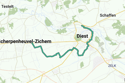 Van station Testelt naar Diest Schaffense poort (op 500 m van het station van Diest) over de Voortberg bij Testelt door de Demerbroeken en langs Zichem en Scherpenheuvel tot Diest
