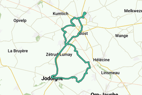 Tienen-Hoegaarden-Outgaarden-Chapeauveau-Pietrain- Jodoigne-Hoegaarden-Tienen (kort stuk onverhard in Jodoigne achter Atheneum, slecht wegdek tss Chapeauveau en Outgaarden). Paar stevige hellingen