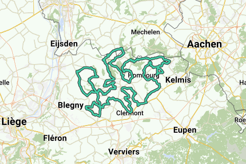 Teuven - ∆ De Plank – S.M.V. – Δ Veurs – Hagelstein – richting Merckhof – ∆ Mabroek – Remersdaal – ∆ Rode Bos – rechts Teuven – Δ Sippenaeken – Terstraten – voor Gemmenich rechts – rechts -∆ Plombières – links Montzen Gare – Δ Teneiken – Plombières – aan de kerk links Δ richting Hombourg – rechts Terhagen – links ∆ Hombourg – aan de kerk naar Montzen – rechts Vivier (▲▲ Kinkenberg ) – Henri-Chapelle – kruispunt rechts richting Battice – rechts Val de la Berwinne – kruispunt rechts ∆ La Clouse – Aubel – links Longue Haie – ∆ Winandchamps – Clermont – Froidthier – oversteken – T links – 1ste weg links, rechts Bois de Halleux – Charneux – ∆Warrimont – Grote weg rechts – rechts Rosmel – ∆ Fosselette – Charneux – Wadeleux – links aanhouden naar ∆ Julemont – grote weg rechts via ∆Mortroux – Bombaye – Warsage – grote weg omhoog ∆ Bois de Winerotte – rechts Neufchateau – Mouhain - Val-Dieu – ∆ Gorhez – links Donsart – grote weg links – rechts ∆ St Jean-Sart – Magis – S.P.V. – ∆ Ulvend - Schildberg - Slenaken - Teuven.