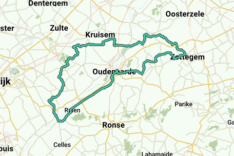 Deze lange versie van "De Vlakke Vlaamse Ardennen" laat opnieuw een stukje Vlaamse Ardennen zien zonder de steile hellingen te moeten beklimmen! Eerst passeren we dezelfde pittoreske dorpjes zoals Dikkele, Meilegem, het mooie Mullem en Wannegem-Lede, maar na Nokere berg (naar beneden!) rijden we deze keer verder richting taalgrens naar de Tiegemberg die we afdalen langs de panoramische achterzijde. Voorbij Tiegemberg rijden we richting Escanaffles om daarna via het nieuwe 15 km lange fietspad terug te bollen richting Oudenaarde. Na een eventuele tussenstop op de markt van Oudenaarde fietsen we terug via Horebeke en Zwalm naar Velzeke. Zeer geschikt voor de racefietser die wel wat kilometers wil opzoeken maar niet al te veel hellingen.
