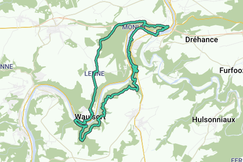 In Waulsort steken we de Maas over en komen langs de noordkant terug. Dit door bossen met opnieuw een steiler stukje tussen Moniat & Noyon Pré. Onder het viaduct van de N96 dalen we af naar de Maas, om deze opnieuw over te steken en deze uitdagende luswandeling te vervolledigen.