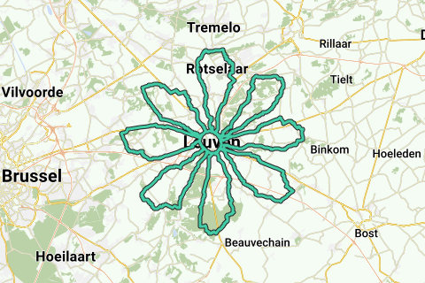 De bloem telt 8 blaadjes van telkens zo'n 20km. De ring van Leuven vormt de bol in het midden van de bloem.