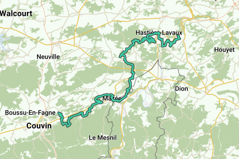 Je verlaat het pittoreske stadje met zijn mooie basiliek en trekt door een golvend landschap met groene bossen naar Chimay en Nismes, waar niemand onberoerd blijft door de grillige vormen van de kalksteen in de ‘Fondry des chiens’. Nog meer bos op weg naar Olly en Doische en in de vallei van de Hermeton, die uitmondt in de Maas. Vanaf daar verken je de hoge plateaus boven de Maas, die je regelmatig even verlaat om naar de rivier af te dalen. Zo kom je in Dinat terecht met zijn machtige citadel en de abdij van Leffe. Langs de oevers van de Maas stap je verder naar Name, waar de Samber in beeld komt! Je wandelt naar de abdij van Floreffe en naar Franière en Ham-sur-Sambre om door de bossen van Fosses-la-Ville naar Mettet en Walcourt te gaan.