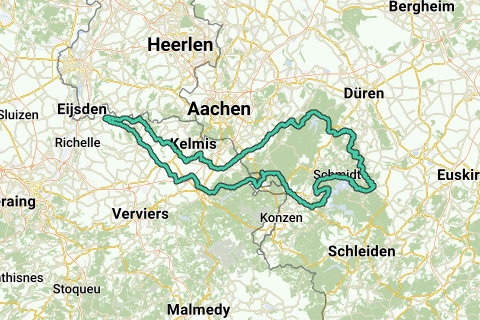 S.G.V. - Kattenroth - Ulvend - Slenaken - Teuven – Remersdaal – Hombourg – Montzen – Busch – Astenet – Walhorn – Raeren – Sief – Walheim – Hahn – Breinig – Breinigerberg – Mausbach – Gressenich – Schevenhütte – Groshau – Kleinhau – Brandenberg – Obermaubach (Stausee Obermaubach) – Zerkall – Brück – Abenden – Lübbenau – Blens – Hausen – Heimbach – Hasenfeld – Scheidam – Schmidt – Steckenborn – Hechelscheid – Woffelsbach – Rurberg – Kesternich – Witzenrath - Lommersdorf - Waldsiedlung (Dreilägerbachtalsperre) – Petergensfeld – richting Eupen – Kettenis – Herbesthal – Welkenraedt – Henri-Chapelle – Merckhof – Hagelstein – S.P.V. - S.M.V. – S.G.V.