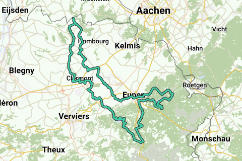 Teuven – Crawhez – Henri-Chapelle – links, rechts – rond punt – rechts – Welkenraedt – Lantzenberg – Heggen – Baelen – Membach – links Eupen – Nispert – Schonefeld – (44) - (43) – (46) – (55) – (41) – (40) – (Δ 58) – (Δ 57) – (59) – (61) grote weg links richting Baraque Michel – aan rond punt rechtsaf (66) – (62) – links (63) – Limbourg – Δ Dolhain – Bilstain – richting Elsaute – rechts Hoof (77) – (45) – (44) – Thimister - Ligne 38 - Aubel - Teuven