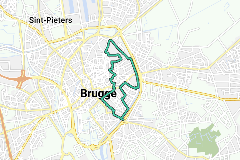 We parkeren onze wagen buiten de Gentpoortvest en wandelen door de Gentpoort het centrum van Brugge binnen. We lopen langs de Magdelanakerk en het Koningin Astridpark langs het vroeger Pandreitje (dat nu een verzameling flats is) naar de Braambergstraat. Hier slaan we rechtsaf en lopen door tot in de Langestraat. Linksaf en onmiddellijk rechts Molenmeers in. Linksaf naar de Verversdijk. Rechtsaf naar de Sint-Annakerk. Linksaf de Jerusalemstraat in (maar vergeet niet rechts naar de Jerusalemkerk te kijken). Via 't Walletje naar de Snaggaardstraat en linksaf Hemelrijk in. Linksaf Oliebaan. Rechtsaf naar de Langerei langs het Grootseminarie en OLv Ter Potterie. Rechtsaf naar de Peterseliestraat en langs de molens en het kanaal Brugge - Gent naar de Kruispoort. We wandelen voorbij het beluik van de gefusileerden verder naar de Balsemboomstraat, linksaf de Langestraat in, weer linksaf de Ganzestraat in en dan rechtsaf de Hooistraat in. We komne aan de coupurebrug en lopen langs de reien en de kleine jachthaven over de brug terug naar ons vertrekpunt.