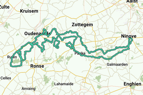 Tocht doorheen de Vlaamse Ardennen met bekende rondehellingen en kasseistroken: vertrek en aankomst Ninove. (Eikenmolen, Rekelberg, Kerkgate, Wolvenberg, Kluisberg, Knokteberg - Côte de Trieu, Oude Kwaremont, Paterberg, Koppenberg, Mariaborrestraat, Steenbeekdries, Taaienberg, Eikenberg, Varent, Het Foreest, Steenberg, Haaghoek, Leberg, Berendries, Valkenberg, Tenbosse, Parikeberg, Muur-Kapelmuur en Bosberg)