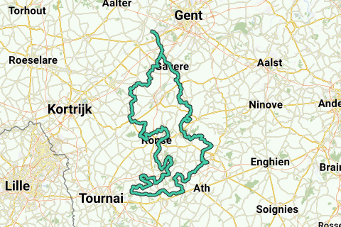 Mooie lus vanuit Deinze (Sint-Martens-Leerne) langs mooie wegen en talrijke beklimmingen via Lessines naar Ath (Henegouwen) en terug via Ronse.
