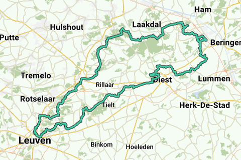 Mooie, volledig verharde route langs autoluwe wegen en voor grootste deel door en langs natuurgebieden. Vrij pittig met 750 hoogtemeters met o.a. beklimmingen : Groddeweg in Linden, Donk en haksberg in Tielt Winge, Grasbos in Molenstede, Gelrodeweg in Aarschot, Moedermeule in Gelrode.