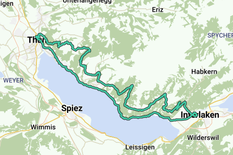De rit is opgesteld om te vertrekken in het centrum van Interlaken nabij het Hotel waar we verblijven. Bij het vertrek rijden we over het scheepskanaal en trekken we de bergen in om hoogte meters te maken opzoek naar de mooiste uitzichten over de landschappen en de Thundersee. Het wordt een bochtige route vol met avontuurlijke momenten en uitzichten.