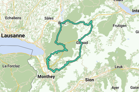 Aigle-Ollon-Villars-Col de la Croix-Diablerets-Col du Pillon-Gstaad-Saanen-Zweisimmen-Jaunpass-Charmey-Broc-Gruyère-Etivaz-Lécherette-Lac Hongrin-Corbeyrier-Yvorne-Aigle