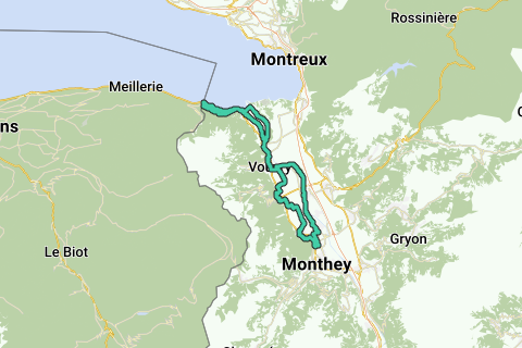 Vanuit Le Bouveret volgt u de Rhône tot het Château de la Porte du Scex. Het werd in 1597 gebouwd en huisvest het Chablais-museum, dat regelmatig culturele tentoonstellingen biedt. Dit gedeelte is afgesloten voor verkeer. Daarna gaat u verder in de richting van Vouvry. Volg de oever van de Rhône naar Illarsaz, waar u de mogelijkheid heeft om een pauze te nemen in het UCI World Cycling Centre. Voordat u in Collombey-le-Grand aankomt, komt u in de buurt van de raffinaderij. Steek Collombey over, dat gedomineerd wordt door het Bernhardinerklooster dat in 1647 werd opgericht. De tour gaat verder door de heuvels van Muraz, voordat u de Stockalperkanal en het natuurreservaat "Rigoles de Vionnaz" en zijn moerassen volgt. Een korte klim leidt u naar de oude stad Vionnaz. Na een kleine omweg komt u in de buurt van de "Grote Muur", waar een bank uitnodigt tot een pauze en een prachtig uitzicht op de Rhônevallei biedt. Ga verder in de richting van Vouvry en les Evouettes, waar u weer verder gaat op het Stockalperkanal. Kaspar-Jodok van Stockalper bouwde deze kanaal in 1648 om het transport van goederen zoals zout te verbeteren. Bij uw aankomst in Le Bouveret gaat het verder in de richting van St-Gingolph door de gehuchten Esserts en Vignolles.
