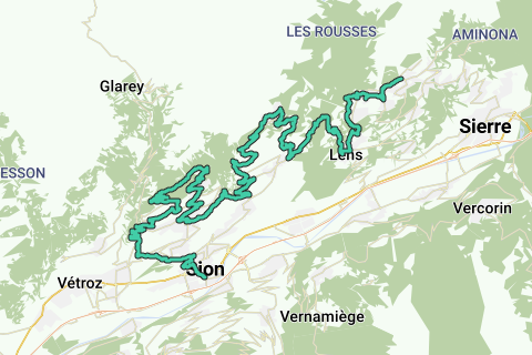 Volg de rode fietspijlen (72: Chemin du Vignoble) vanuit Sion in de richting van Mont d'Orge, waar u de Chemin du Vignoble (wijnweg) neemt. Wanneer u in de richting van Mayens de la Zour omhoog klimt, heeft u het gevoel helemaal alleen op de wereld te zijn. De korte afdaling naar Savièse gebeurt via een mooie weg die u naar het dorp Grimisuat leidt, voordat u naar Anzère (1.546 m) klimt. Nadat u de gemeente Ayent heeft verlaten, leidt de laatste klim van de dag u door de dorpen Icogne en Lens, voordat u de laatste aanloop naar het beroemde vakantieoord Crans-Montana maakt. Het Christuskoningsbeeld, dat in 1935 op de top van de Châtelard-heuvel in Lens werd opgericht, brengt u omhoog. Na deze eerste etappe heeft u 58,8 km verzameld, met drie beklimmingen van in totaal 2.300 hoogtemeters.