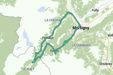 Van Vernayaz (453 m) neemt u de oude route van de diligence, de eerste historische route tussen Martigny en Chamonix, die in het midden van de 19e eeuw werd aangelegd. Rijd door de dorpen Salvan (934m) - Les Marécottes (1.030m) - La Médettaz (1.068m) - Le Trétien (1.021m) - Finhaut (1.224m) - Giétroz (1.360m) - Châtelard-Village (1.123m) - Châtelard-Frontière (1.116m) - Vallorcine (1.260m). Van daar verlaat u de route van de diligence en gaat verder naar Esserts (1.549 m), dan naar de Tête Noire (1.199 m) - Trient (1.231 m) en naar de Col de la Forclaz (1.528 m). Geniet van het adembenemende uitzicht op Martigny en het Rhônedal. Vervolgens gaat u verder door de kleine dorpen La Fontaine (846m) – Plan Cerisier (600m). Dan steekt u de wijngaard over naar de middeleeuwse toren van La Bâtiaz (574m). Dan verder in de richting van Vernayaz (453m).