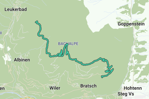 De Torrentbaan brengt uw mountainbike zonder extra kosten naar het bergstation Rinderhütte. Over een singletrail met indrukwekkend uitzicht op het Rhonedal en over de Walliser bergen bereikt u uiteindelijk Oberu en Bachalp. Van daaruit komt u aan de rand van een lariksbos. Na een paar bochten op de asfaltweg bereikt u het offroad-pad in de richting van Albinen. Vervolgens gaat u weer terug naar de hoofdweg naar Leukerbad. Een afwisselende en snelle route. Let alstublieft op wandelaars langs de route.
